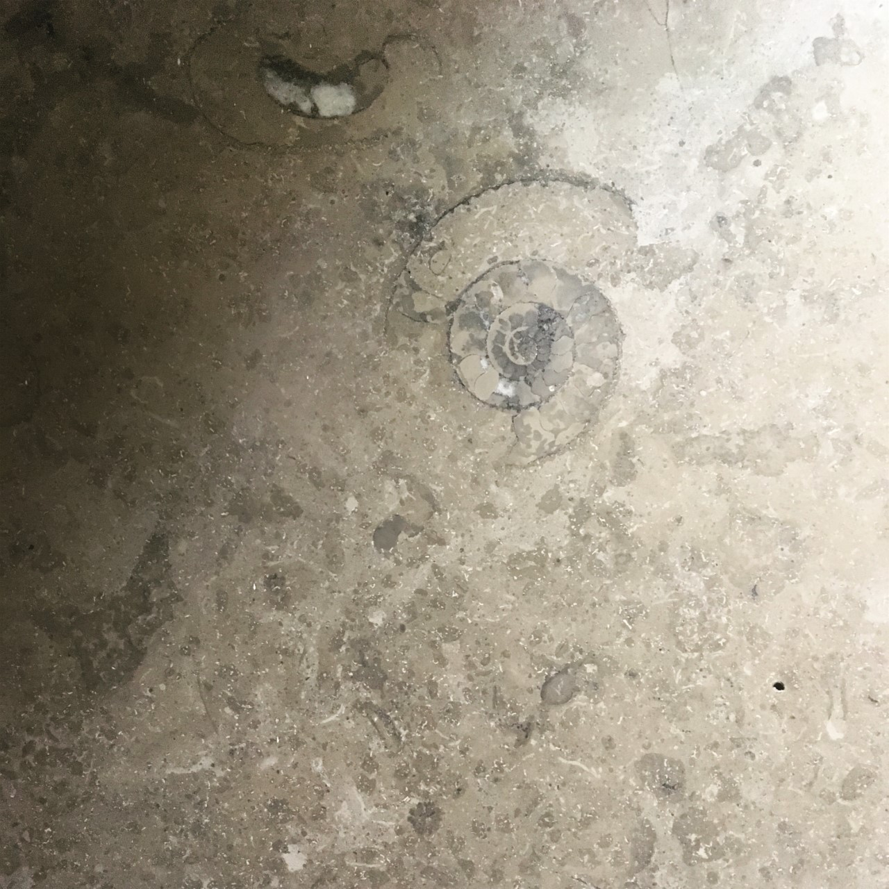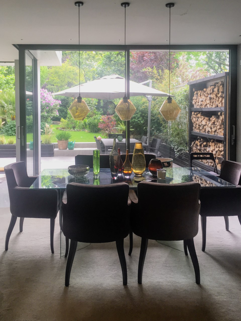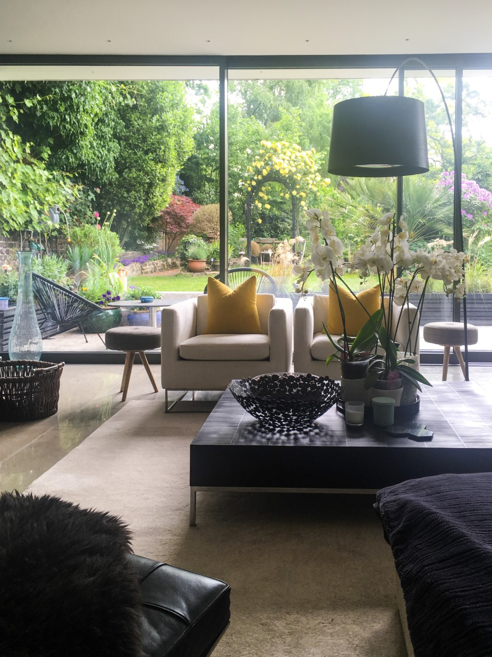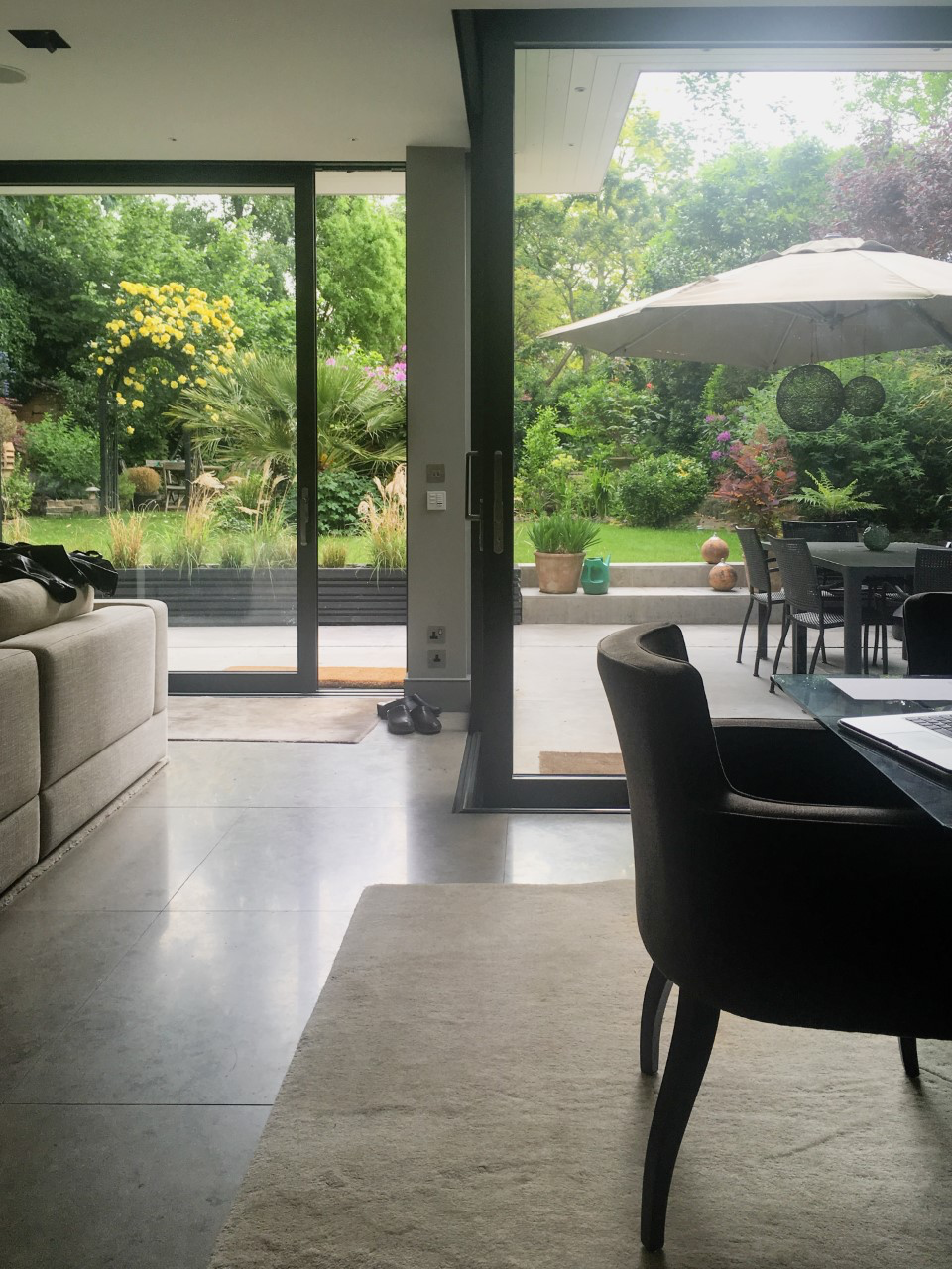 … I actually gasped when I turned the corner and saw this garden just streaming in through the floor to ceiling glass. I had just nipped down to go to the loo and having witnessed the Georgian glory upstairs was not anticipating such sights as I went lower! Obviously the full height sliding doors are the standout feature in this space enabling all that lovely green to flood in, but what was also really well thought out was the use of the large fossil tile that went throughout this space. From the floors, into the bathroom, on the walls and out to the garden (or an exterior version that looked near identical in tone) Resulting in the whole area feeling seamless and luxe and I loved it! Also who doesn’t love spotting a fossil..?! Spent most of the morning picking my favourite one out during each loo visit/tea grab/… perpetual cycle right there!