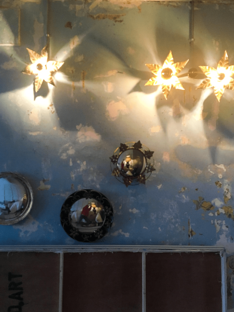 The front room is full of lovely features, the brass tiled wall being the obvious star here. Even shimmering in the dank light tis very atmospheric and a great base for styling against it, perfectly in juxtaposition against the panelled white wood, which makes it zing even more. LOVES it. My instagram life tells me its made by Quirky Interiors based out in my former homelands of Herts, soon may need to go have a peruse at their stuff asap. The walls and ceiling are part distressed with beautiful metal flower lights giving an ethereal glow to the rawness and highlighting the pretty blue paintwork. The light outside is so so dim though that catching much detail without taking over the shoot and lighting set up is not really poss! Damn you monsoon!